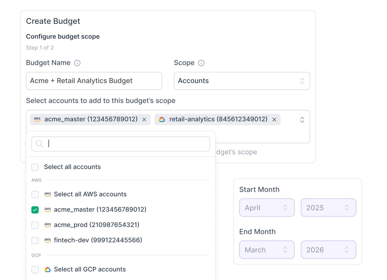Choose scopes like cloud providers (AWS, Azure, GCP, Oracle Cloud), accounts, regions, services, or cost reports such as "EC2 usage last month." This precision keeps budgets tied to your operational reality.