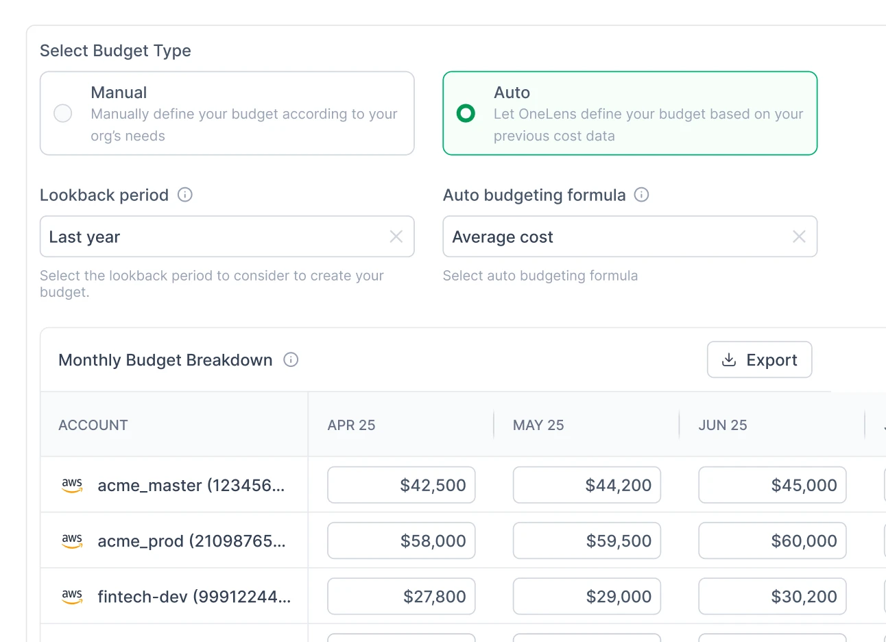 Auto Create reviews your lookback period data to understand usage patterns and baseline budgets across accounts, scaling effortlessly for complex multi-cloud environments.